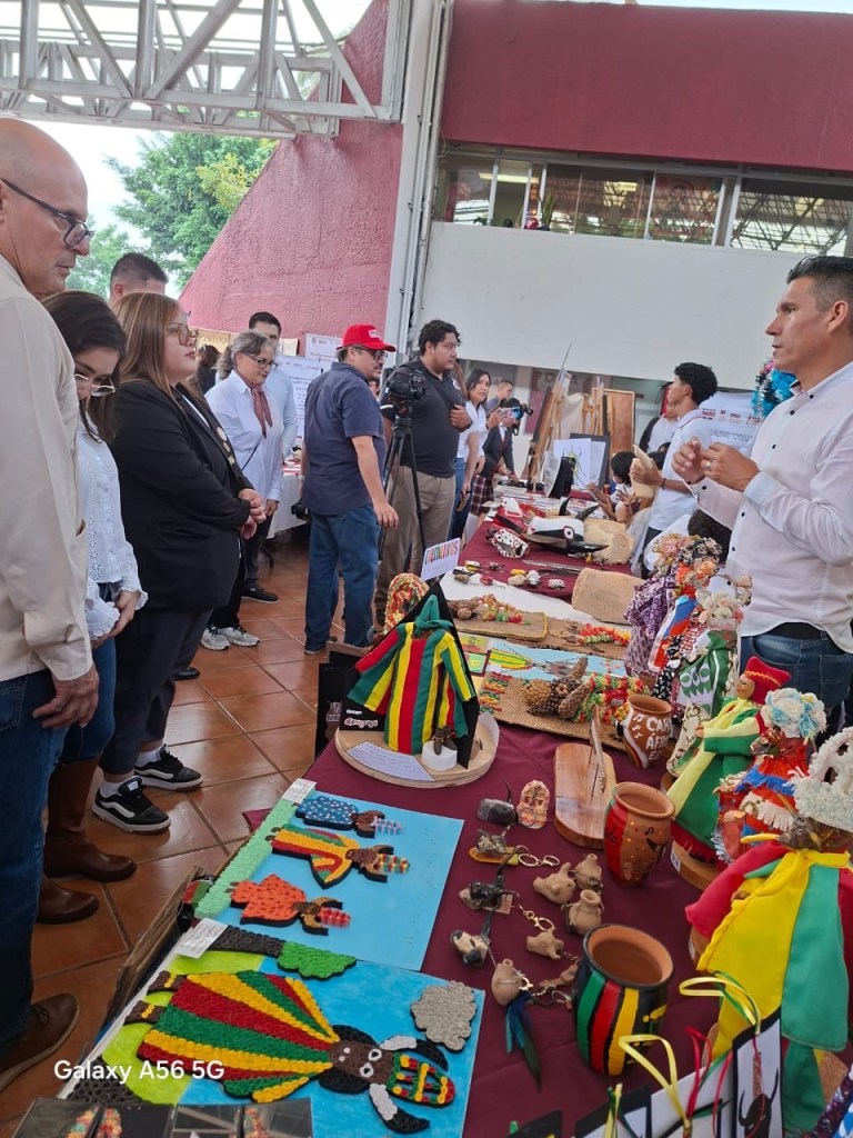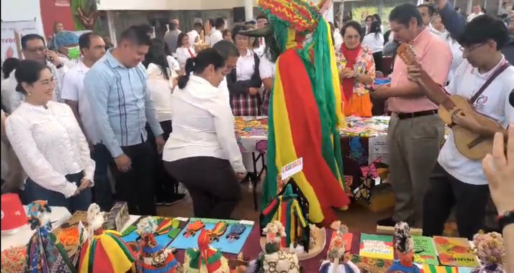 La Secretaria de Educación, Claudia Tello Espinosa, recorrió el evento y visitó personalmente el stand del Telebachillerato El Espinal, donde se maravilló con las máscaras de toro, muñecas con los tradicionales “batones”, pinturas y artesanías elaboradas con semillas y materiales naturales. En un momento que quedará en la memoria de todos los presentes, la funcionaria participó activamente en la Negreada, danzando junto a uno de los integrantes que portaba la máscara de toro, mostrando su entusiasmo y respeto por la tradición.