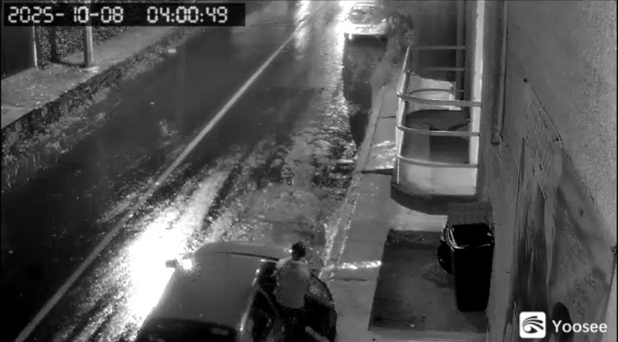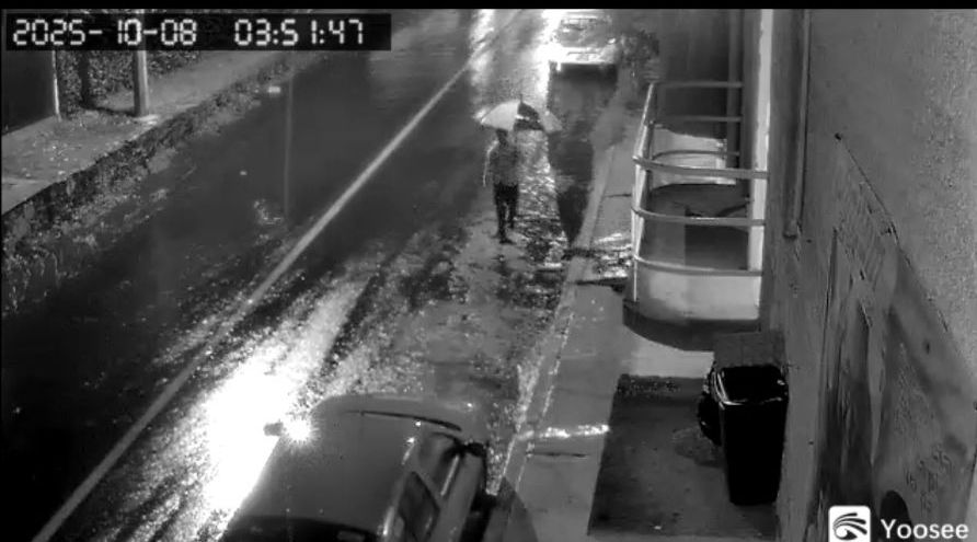 El sujeto, vestido con sudadera naranja, gorra negra y pantalón oscuro, avanzó sigilosamente por la calle, resguardándose de la lluvia con una sombrilla. Se detuvo frente a un vehículo, lo observó con cuidado y palpó cada cerradura. Tras unos segundos, cerró la sombrilla sobre la puerta trasera, metió la mano y abrió la puerta. Al revisar el interior y no encontrar objetos de valor, salió rápidamente, evaluando la situación bajo la luz tenue de la madrugada.