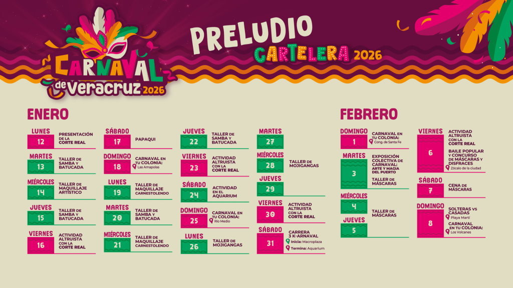 “En cuatro colonias durante los cuatro domingos de preludio de Carnaval vamos a regresar el Carnaval en tu Colonias con un pequeño papaqui y con escenario todos los domingos con artistas veracruzanos que podrán llevar la algarabía a cada una de las colonias. Vamos a estar en Río Medio, en Amapolas, en Los Volcanes y en la Congregación de Santa Fe”, explicó el regidor octavo del Ayuntamiento de Veracruz, Daniel Martín Lois.