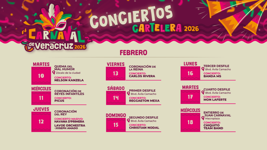 Veracruz, Ver.- Carlos Rivera, Mon Laferte, Christian Nodal y Nelson Kanzela, entre otros son algunos de los artistas que integran la cartelera artística del Carnaval de Veracruz 2026 que se realizará del 10 al 18 de febrero.