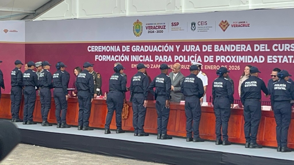 Emiliano Zapata, Ver.– Con la entrega de equipamiento táctico y unidades vehiculares, la gobernadora de Veracruz, Rocío Nahle García, encabezó la ceremonia de graduación y jura de bandera de nuevos policías de proximidad estatal, quienes se integran a las labores de seguridad en la entidad.