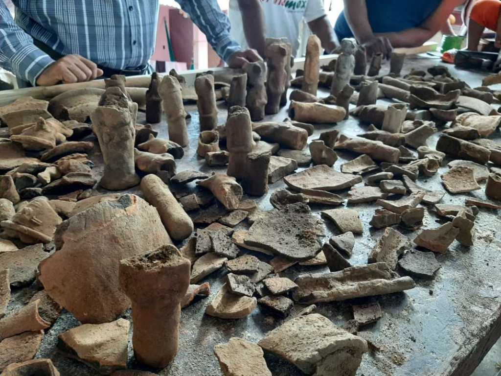 Entre los vestigios se hallaron representaciones de aparentemente dioses hechos con barro, así como vasijas las que se encontraban mayormente rotas debido a los años que llevaban enterradas en el sitio, considerado uno de los puntos con más historia de Ixhuatlán del Sureste.