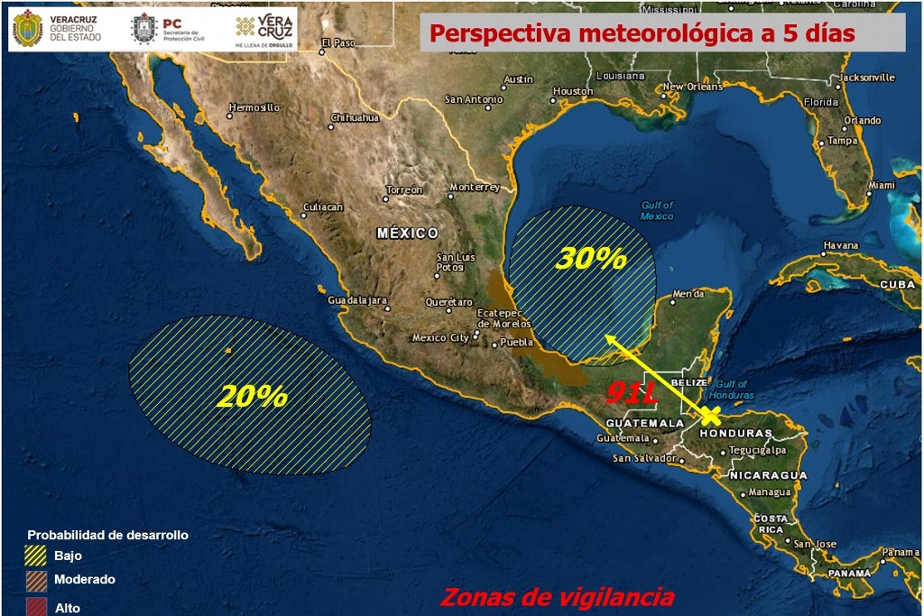 El Centro de Estudios y Pronóstico Meteorológico de la Secretaría de Protección Civil de Veracruz, informó que se mantiene en vigilancia el disturbio 91L.