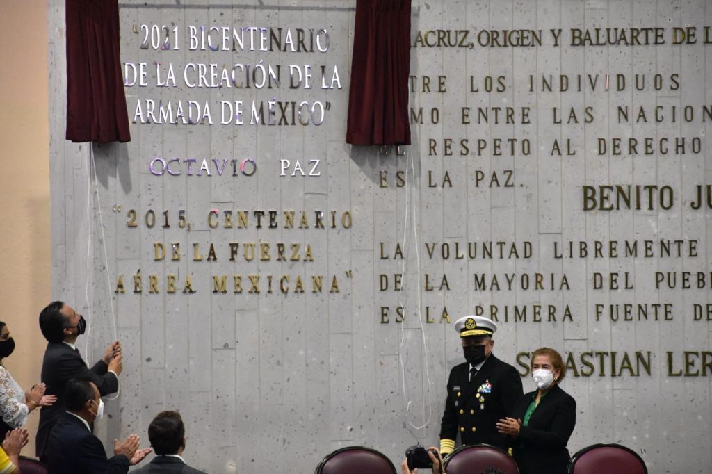 XALAPA, VER.- El Gobernador del estado, Cuitláhuac García Jiménez, encabezó el acto solemne de inscripción de las letras de oro de la leyenda “Año 2021 bicentenario de la Marina Armada de México” en el muro de honor del recinto legislativo del Congreso de Veracruz.