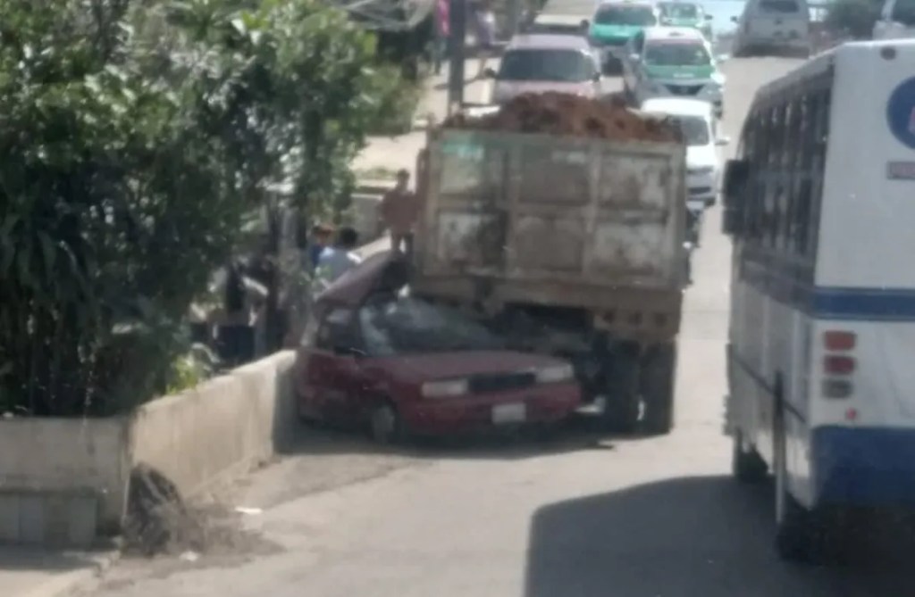 Xalapa, Ver. 11 de noviembre 2021.- Un camión repartidor de tierra tipo volteo le cayó encima a un automóvil estacionado en la colonia Ciudad de las Flores al norte de Xalapa.