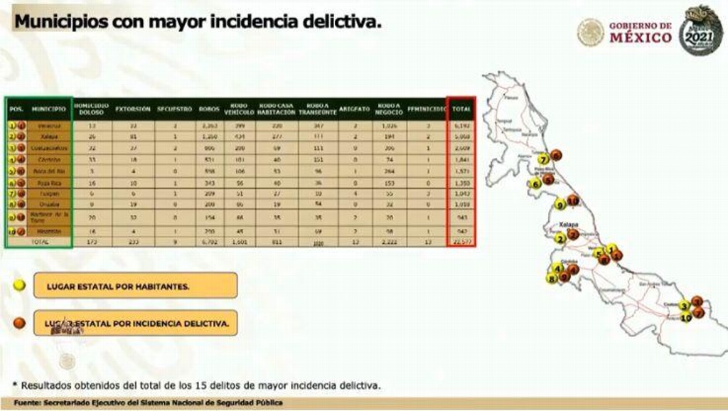 El secretario de Marina , almirante, José Rafael Ojeda, informó que hay una disminución de la incidencia delictiva en la entidad veracruzana, respecto a los municipios indicó que Veracruz ocupa el primer lugar, seguido de Xalapa.