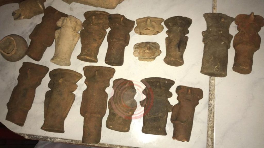 Ixhuatlán del Sureste, Ver 9 julio 2021.- Un rostro prehispánico, figurillas de barro y lo que pareciera ser un bastón o cetro, fueron hallados en el municipio de Ixhuatlán del Sureste en el predio donde se pretendía construir una vivienda y al momento de realizar excavaciones, salieron a la luz hallazgos arqueológicos.