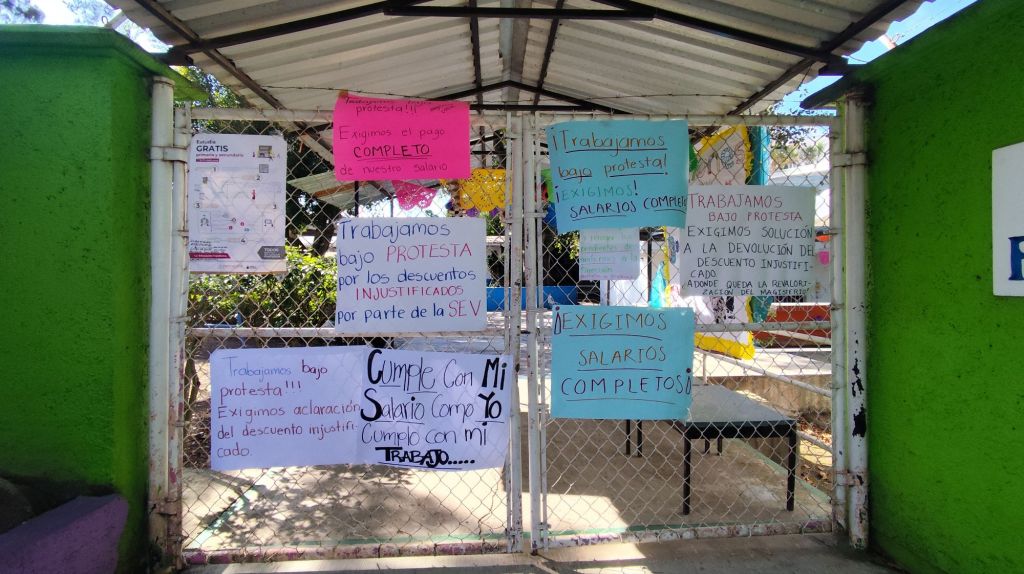 Xalapa, Ver.– Personal docente y administrativo del Jardín de Niños Paulo Freire, ubicado en la colonia Higueras, se manifestó de manera pacífica tras detectar descuentos injustificados en sus salarios correspondientes a la última quincena.