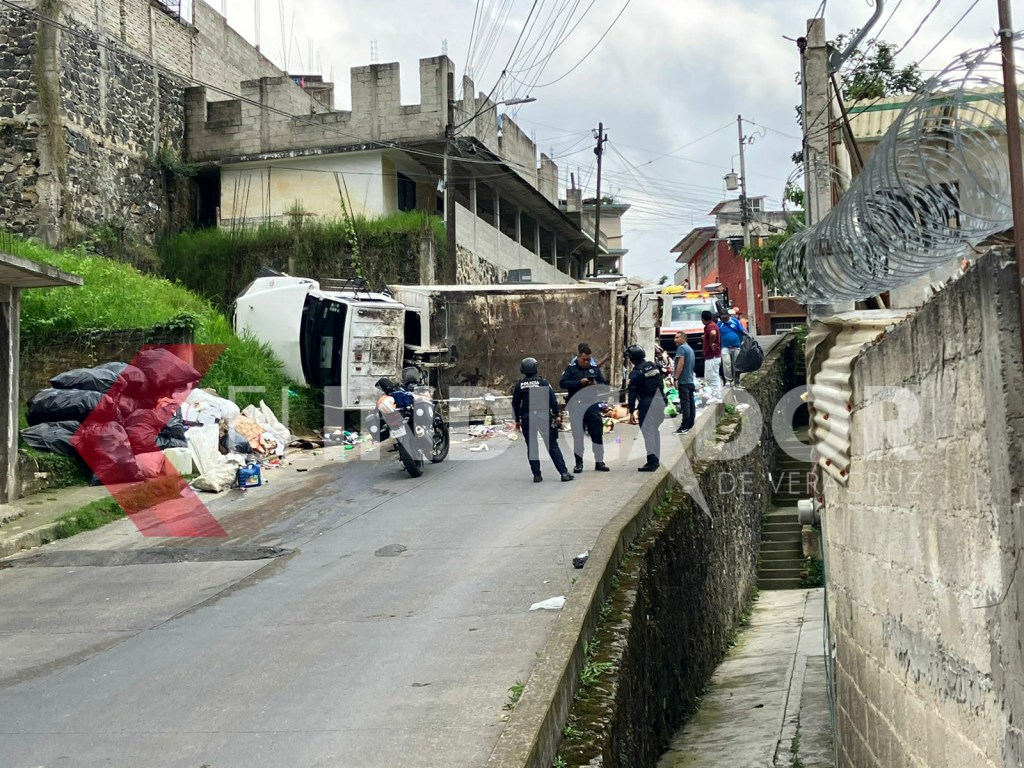 La tarde de este jueves, un camión de limpia pública terminó volcado sobre la calle Manzanas, ubicada en la colonia Veracruz, en Xalapa. Se presume, se quedó sin frenos.