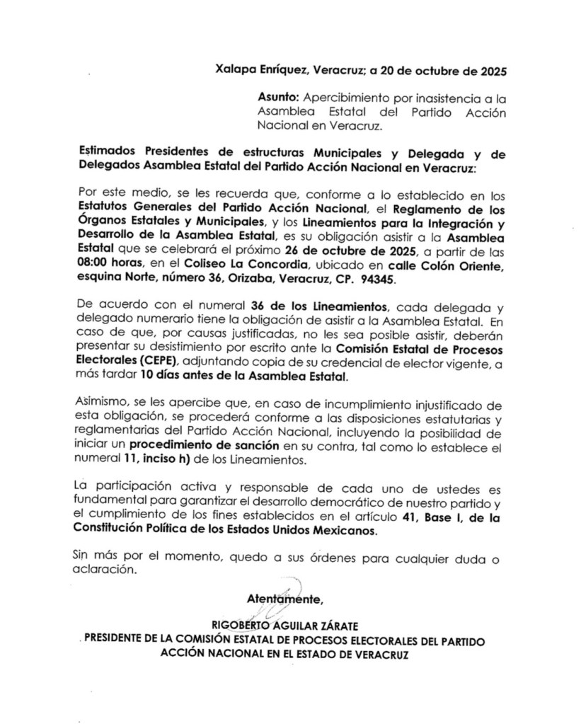 A pesar de esta situación, dirigentes del PAN Veracruz han presionado a presidentes municipales y delegados para asistir a la Asamblea Estatal, bajo apercibimiento de sanciones internas en caso de inasistencia.