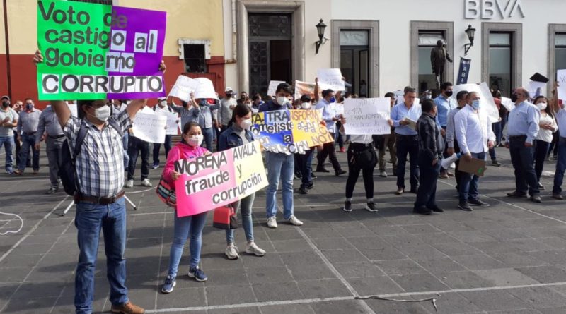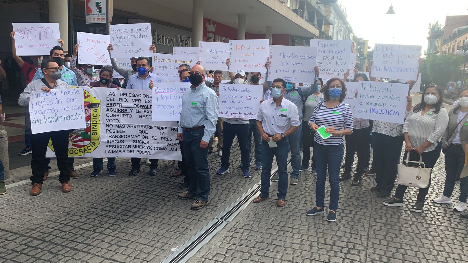 Xalapa, Veracruz., 03 de Junio de 2021.- Agremiados del Sindicato Democrático de Trabajadores de la Educación de Veracruz (SDTEV) se manifestaron en la Plaza Sebastián Lerdo de Tejada de esta capital para exigir al gobernador Cuitláhuac García Jiménez ser respetuoso de las instancias laborales y que sean ellas, quienes juzguen de manera imparcial la situación de la demanda laboral ante el Tribunal de Conciliación y Arbitraje (TECyA), así como del recurso de revisión interpuesto ante el Juzgado de Distrito con respecto a la toma de nota fraudulenta otorgado a la otra fracción.