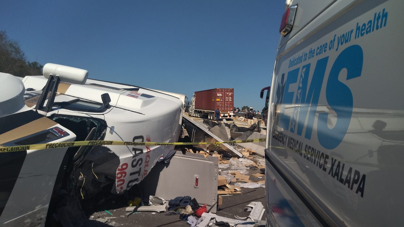 XALAPA, VER.- El conductor de un tráiler que transportaba productos de abarrotes, murió tras volcar la unidad sobre la carretera Xalapa-Perote la mañana de este miércoles 2 de febrero.