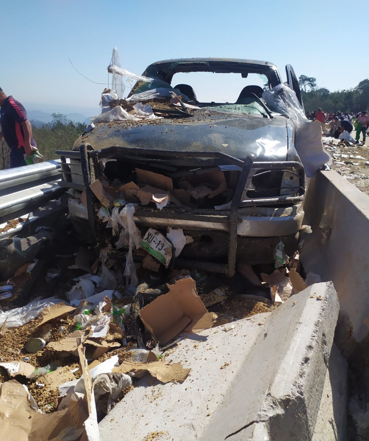 Los abarrotes quedaron regados en el pavimento tras el accidente, se trataba de arroz, maíz y avena, entre otros que afortunadamente no fueron objeto de rapiña.
