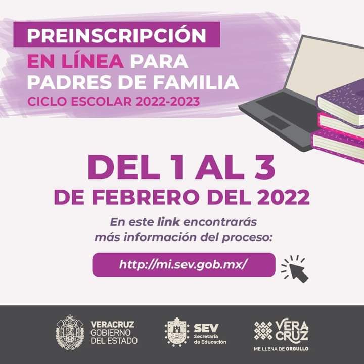 Xalapa, Ver., 27/01/22.- La Secretaría de Educación de Veracruz (SEV) lanza la convocatoria de preinscripción proceso en línea y gratuito para el Ciclo Escolar 2022-2023, del 01 al 16 de febrero, correspondiente a Educación Inicial y Básica, así como primer grado de secundaria; esto, conforme el calendario de la Secretaría de Educación Pública SEP.